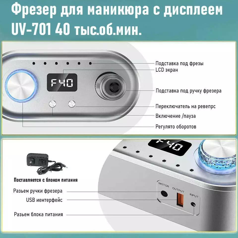 Фрезер для маникюра с подсветкой Nail Drill UV-701 40 000 об/м стильный аппарат машинка маникюрная для ногтей