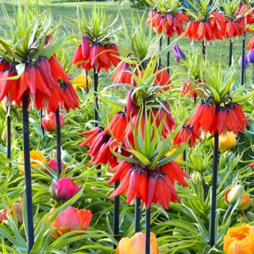 Фритиллярия Рубра, также называемая рябчик императорский – это соцветие из 6-7 крупных колокольчикообразных цветов, собранных на самой верхушке цветоноса. Сорт может вырастать до 1 м, интересно смотрится в альпинариях и миксбордерах, может быть использован для срезки. В букетах будет стоять до 2 недель.