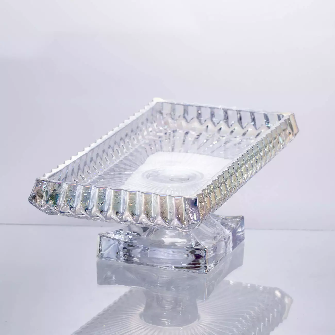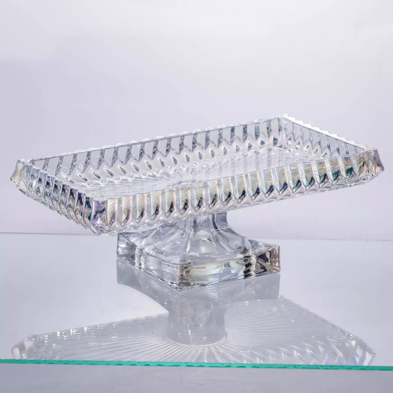 Фруктовниця на ніжці прямокутної форми виготовлена з товстого скла, що забезпечує міцність та надійність під час щоденного використання. Розміри 28 × 15 × 10 см дозволяють ефектно розмістити фрукти, десерти або інші частування для святкового чи повсякденного столу. Висота ніжки 6,5 см піднімає композицію над поверхнею, додаючи сервіруванню виразності.