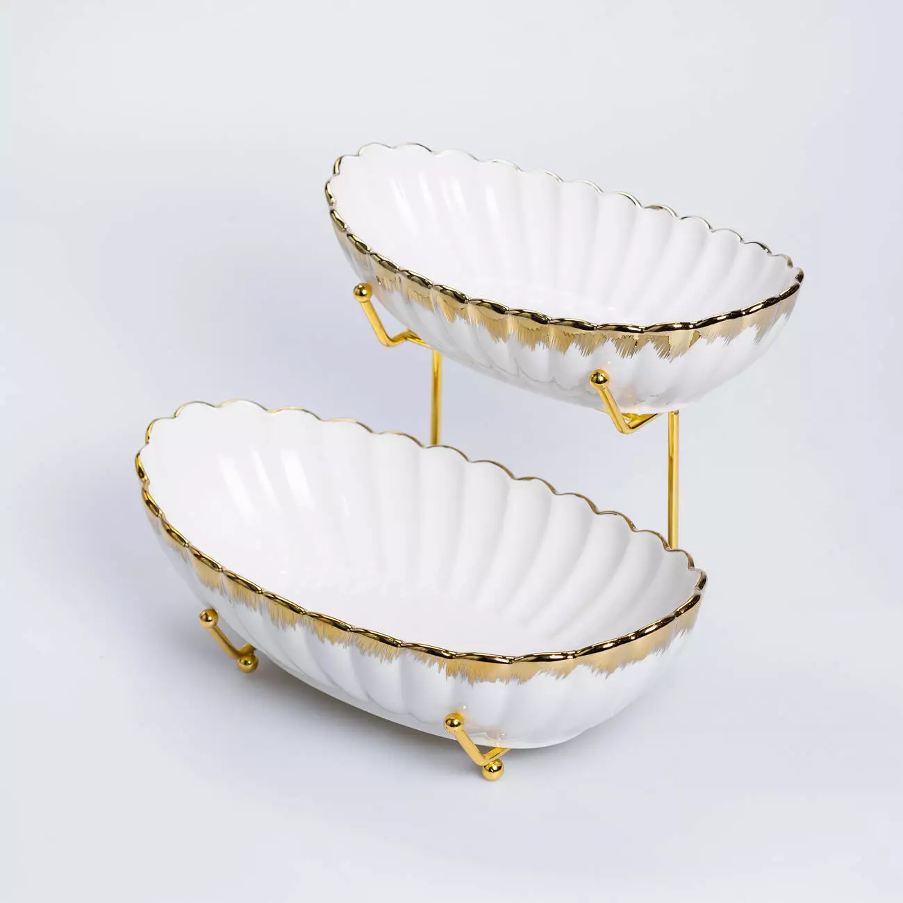 Конструкція фруктовниці виконана на металевій золотистій підставці, яка забезпечує стійкість та додає декоративного акценту. Завдяки двоярусному розташуванню фрукти займають менше місця на столі, зберігаючи при цьому охайність та зручний доступ. Такий виріб стане доречним як у повсякденному використанні, так і для святкового сервірування.