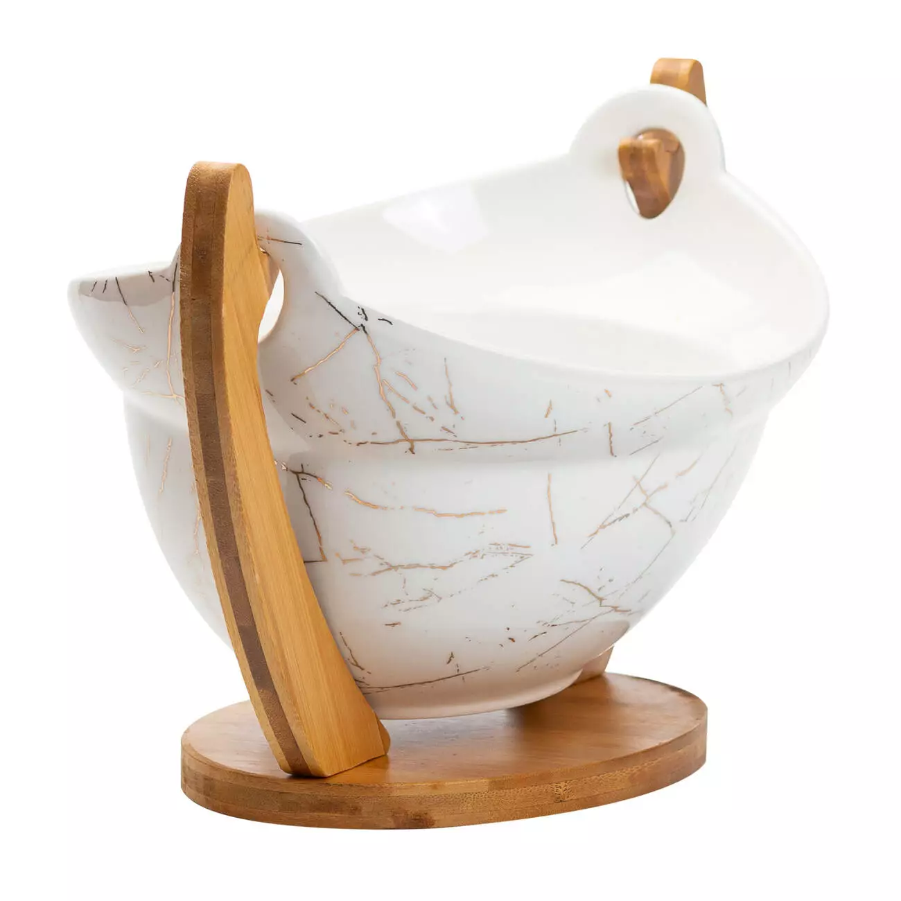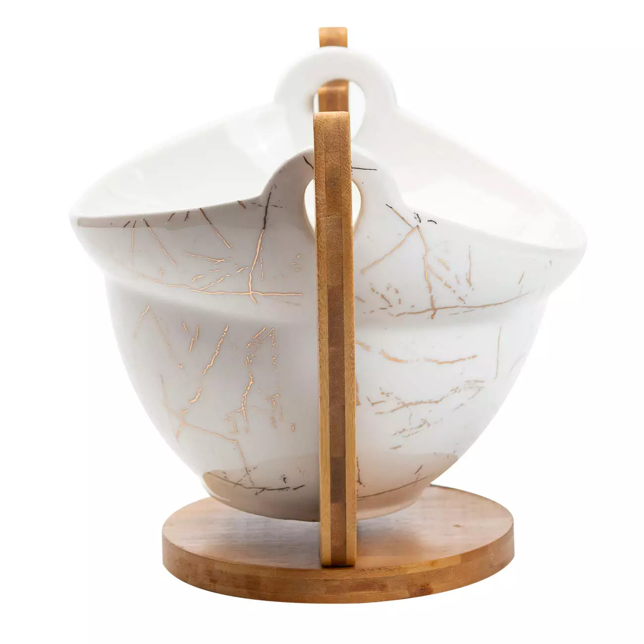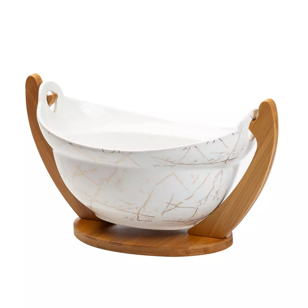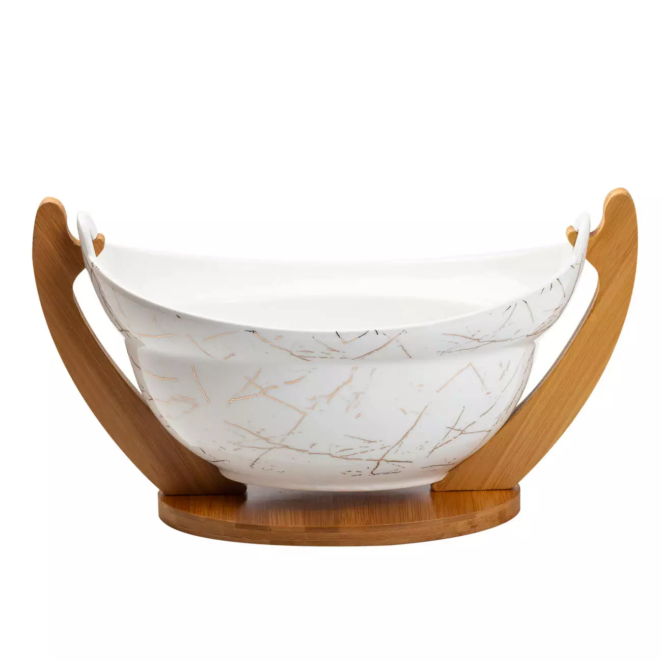 Фруктовниця виготовлена з високоякісного порцеляни, має стильний білий мармуровий дизайн із золотистими вкрапленнями, що надають їй особливого шарму та розкоші. Такий витончений вигляд робить її ідеальним доповненням до будь-якого інтер'єру, привертаючи увагу своїм естетичним оформленням.