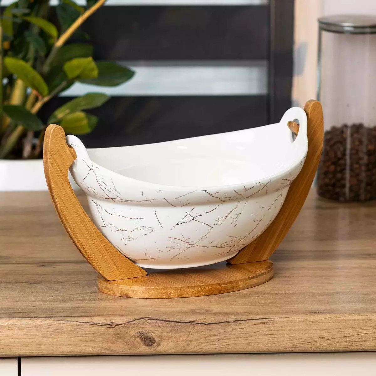 Оригінальна бамбукова підставка додає фруктовниці природної теплоти та забезпечує її стабільність. Бамбук, як екологічно чистий матеріал, підкреслює природну красу виробу та додає нотку сучасності. Завдяки своєму дизайну, фруктовниця зручно підходить для зберігання та подачі різноманітних фруктів, створюючи затишну атмосферу на вашому столі.