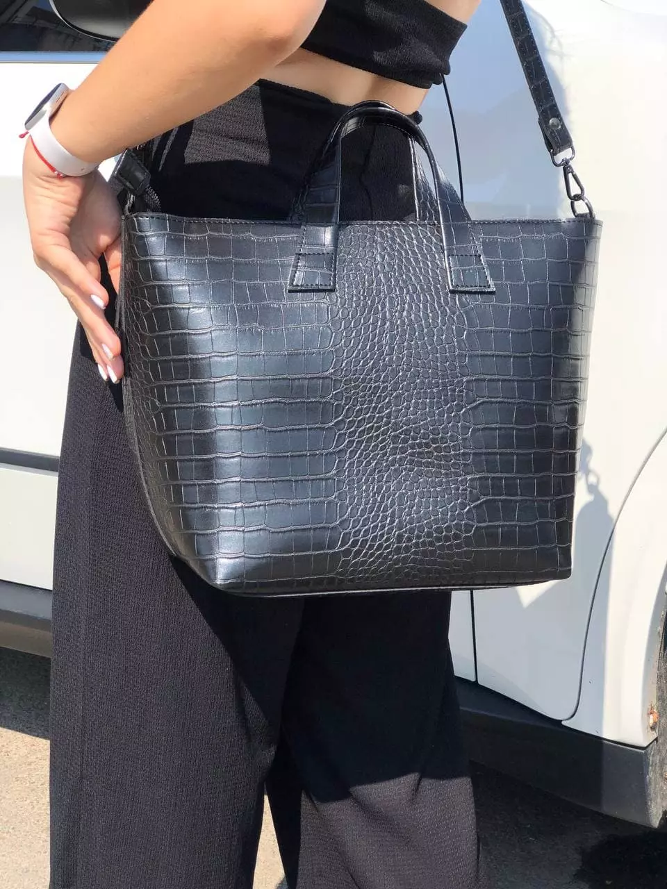 продуманный образ, но сумка черного цвета подойдет к любой одежде,