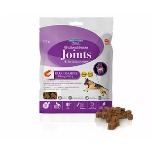 FUNCTIONAL SNACK снеки для собак JOINTS, 175 г Функціональні снеки "MEDITERRANEAN NATURAL" - ласощі, що виготовлені на 100% з натуральних компонентів. Не містять глютену, штучних барвників, ГМО або транс-жирних кислот і є природним джерелом Омега 9. Властивості: Сприяють розвитку та зміцненню сухожиль та суглобів. Склад: 61% м'яса (24% хамону, 22% курячого м'яса, 15% яловичого м'яса), рис, рослинний гліцерин, сухе молоко, лосось, тунець, екстракт краба 1%, екстракт креветок 1%, пивні дріжджі. Добавки: консерванти: лимонна кислота, мурашина кислота. Харчові добавки: олія материнки, розмарину, вітамін A 7333, вітамін D3 2000, вітамін E (альфа-токоферол) 23,4. Аналітичні складові (на 100 г): сирий протеїн: 28,3%, сирий жир: 6,8%, сира зола: 16,2%, клітковина: 0,7%, волога: 16,4%, Кальцій 3,0г, фосфор 1,5г, омега3: 0,10г (DHA 24 мг); омега6: 0,72 г; олеїнова кислота "омега 9": 1,70г, глюкозамін: 480мг. Енергетична цінність (ккал/100 г): 301 Ккал / 100г. Рекомендована добова норма: Маленькі собаки: 5-10 шт Середні собаки: 11-20 шт Великі собаки: 21-30 шт