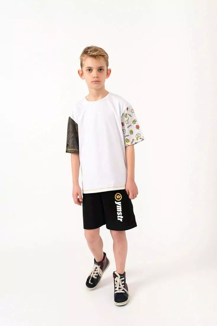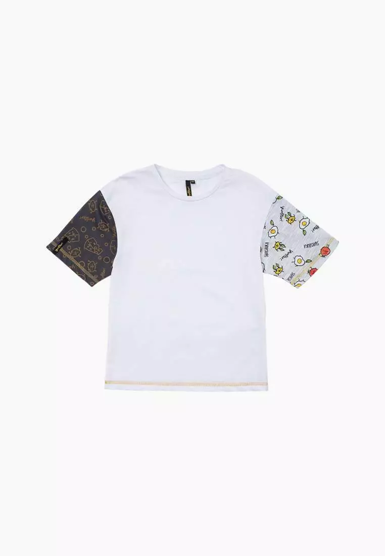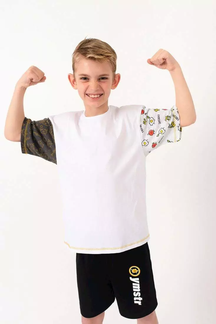 білого кольору. Рукава з різною тканини з принтом "Yumster. Кругла