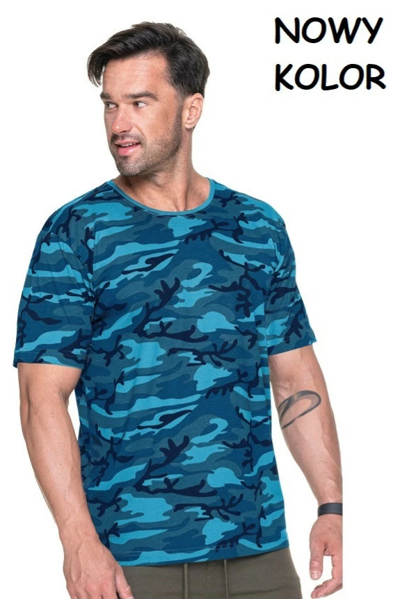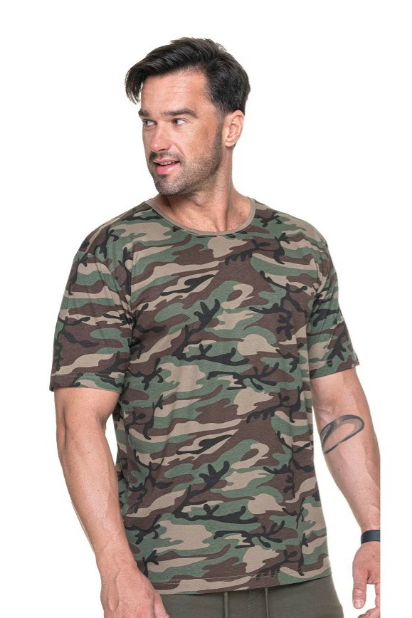 Чоловіча камуфляжна сорочка. М’яка і гладка тканина одноарного джерсі з набивним камуфляжним малюнком. Виріз горлани оброблено еластичною теською, плечовою теською і подвійною стручковою стрічкою. Вага: 170 г/м2. Состав: 100% напівхрещеної бавовни.Розмір від S до 3XL