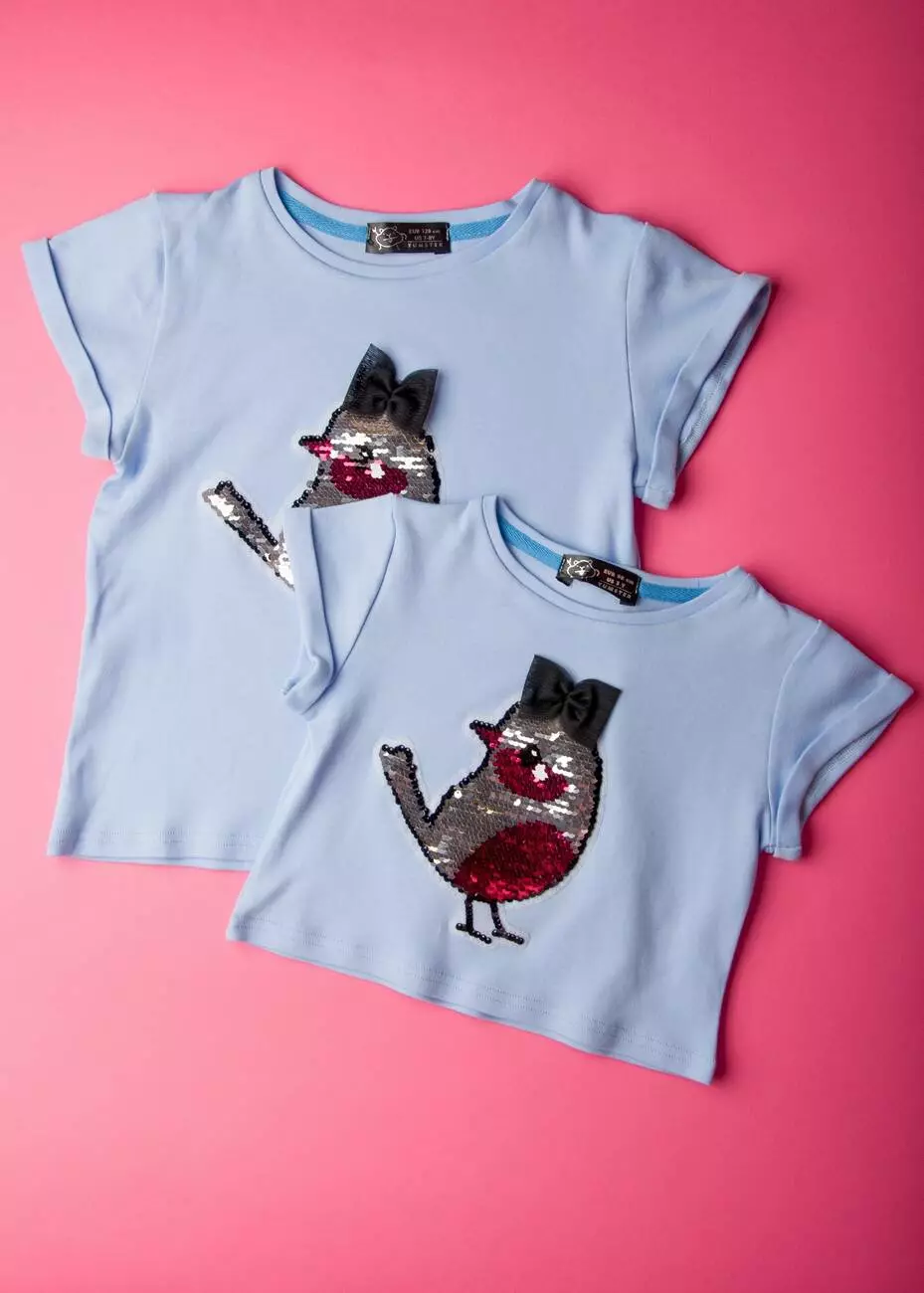 аплікація - перевтиш з паєток "Пташка". Фасон футболки - прямий