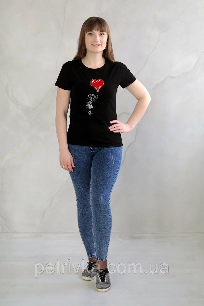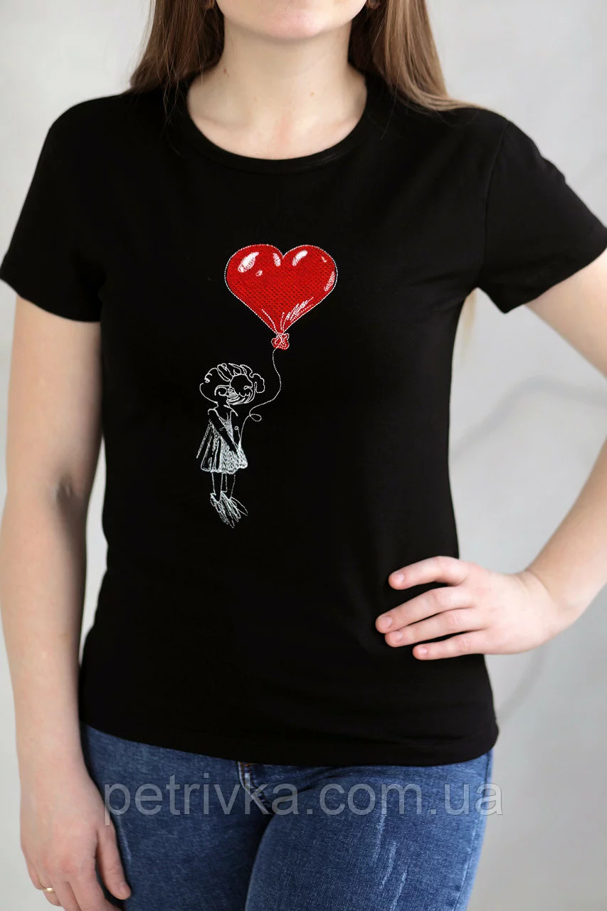 Жіноча Чорна футболка в стилі CASUAL, з вишитим принтом Дівчинка з