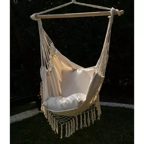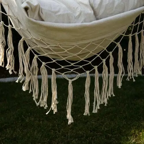 МІЦНИЙ МАТЕРІАЛ - 65% бавовна забезпечує гарну вентиляцію, що підвищує комфорт використання підвісного крісла навіть у спекотні дні. За довговічність сидіння відповідає 35% домішка поліестеру. Міцне монтажне кільце з'єднане з міцними мотузками, рівномірно розподіленими з обох боків гамака через дерев'яну перекладину. Така конструкція дозволяє легко повісити гамак, він добре збалансований та стійкий.