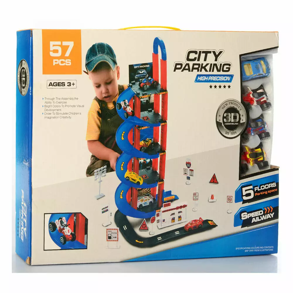 Фотография 1 товарной позиции интернет-магазина детских игрушек www.smarttoys.com.ua Гараж 0908-13A 5 поверхів, транспорт, дорожні знаки, 57 дет., кор., 43,5-31,5-6 см.