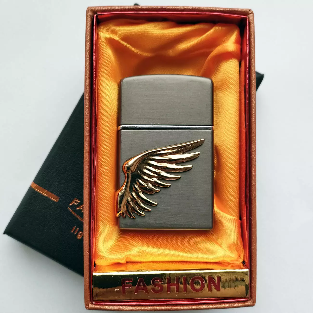 Эффектная турбо-зажигалка Fashion Wing — стильный аксессуар с металлическим корпусом и объёмным декоративным элементом в виде золотого крыла. Корпус выполнен из прочного металла с матовым покрытием, а мощное турбо-пламя зелёного цвета обеспечивает стабильное горение даже при ветре.