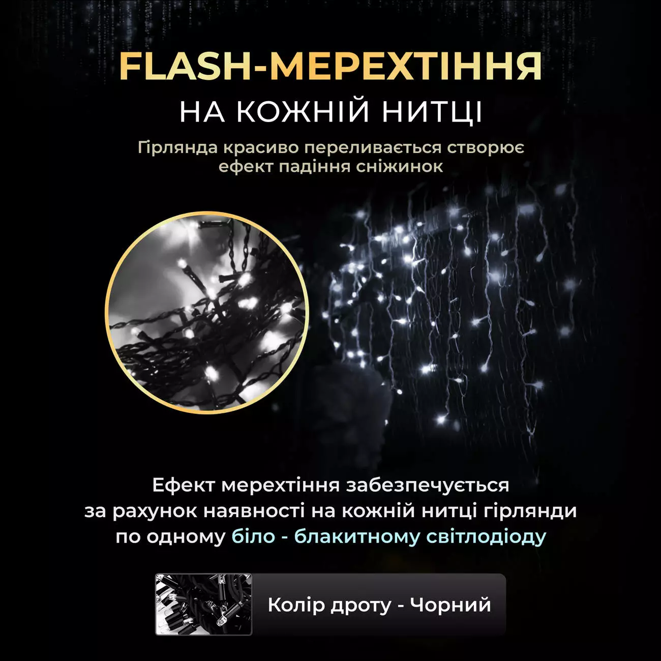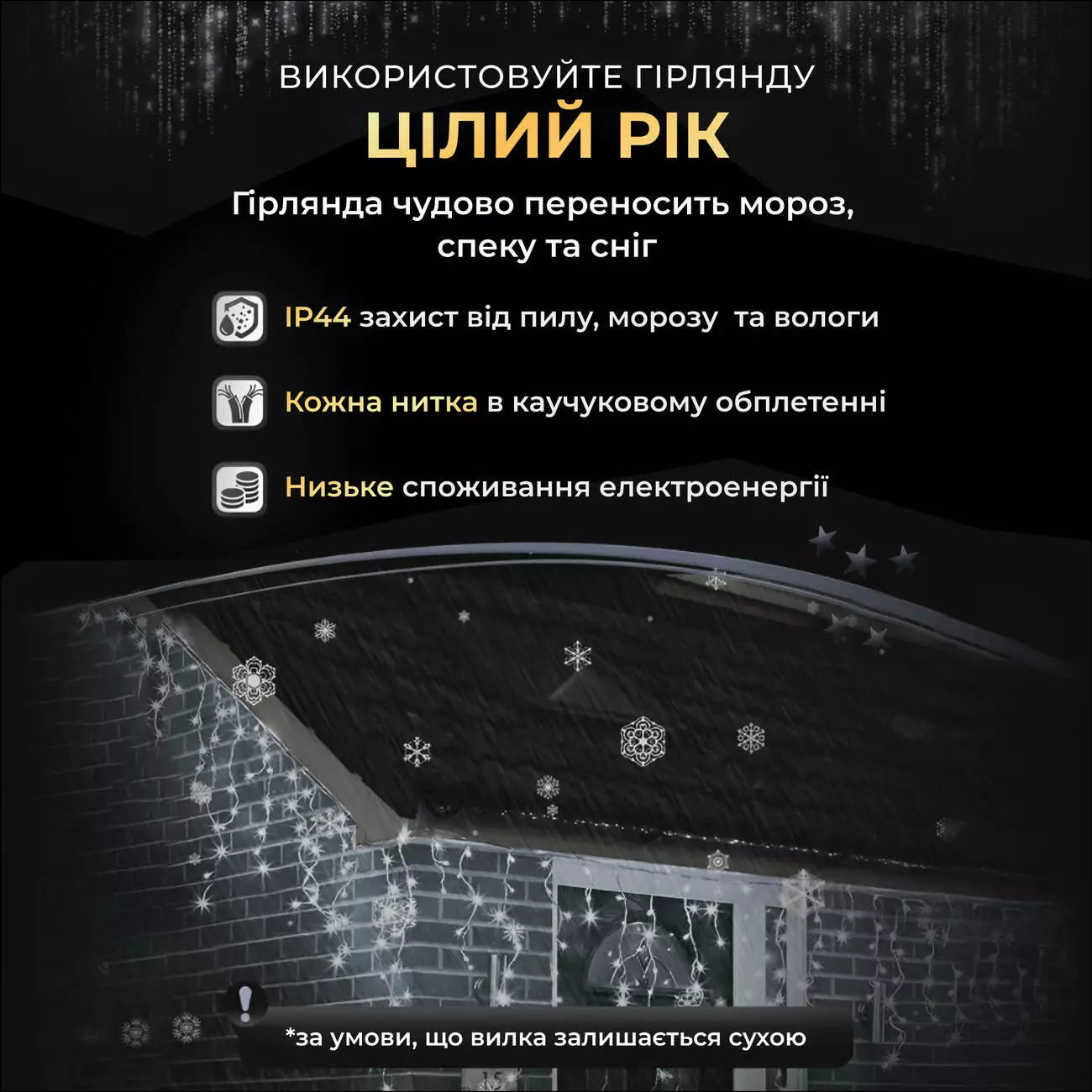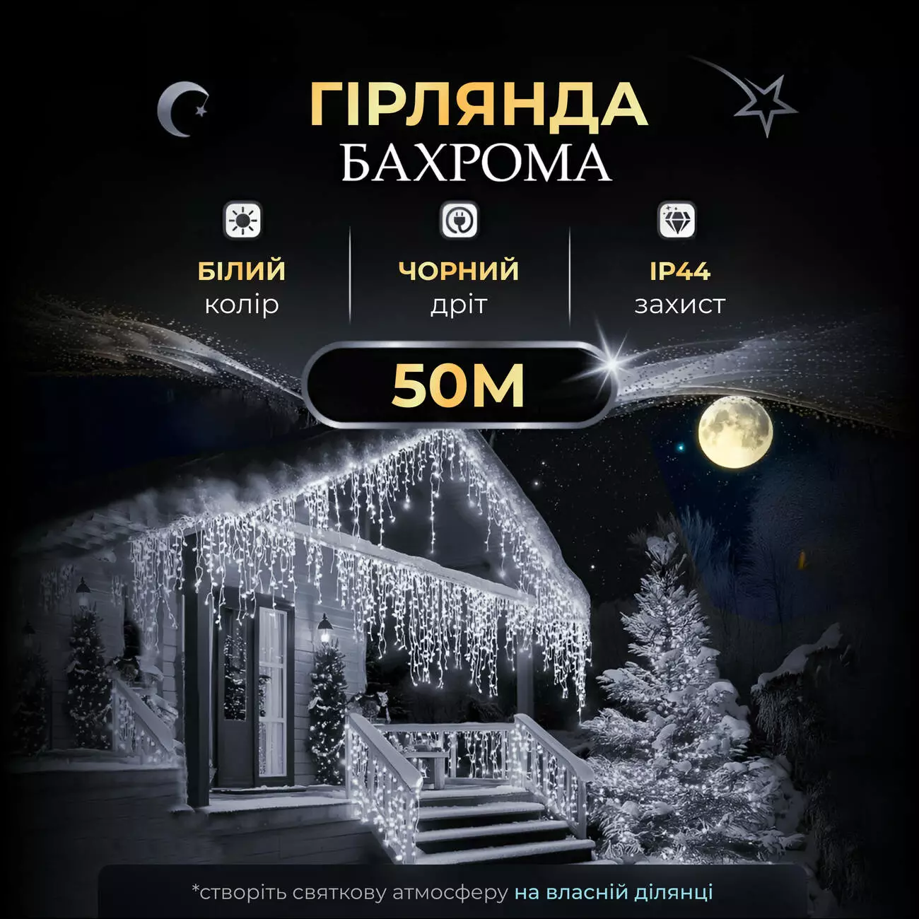 Гірлянда «Бахрома» з 840 LED лампочками створює атмосферне освітлення для зовнішнього або внутрішнього декору. Довжина основного шнура становить 50 метрів, що дозволяє прикрашати фасади будинків, вікна, балкони, альтанки чи вітрини. Завдяки чорній нитці гірлянда непомітна вдень і виглядає акуратно при монтажі, а в темний час доби рівномірно розсіює світло, створюючи святкову ілюмінацію.