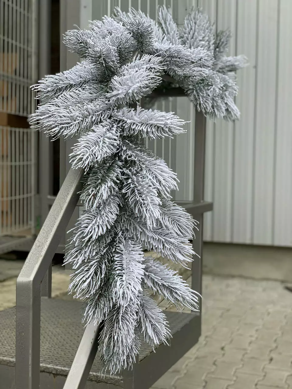 Хвойная гирлянда изготовлена путём переплетения искусственных сосновых веток. Все ветки пышные как у настоящей сосны засчёт длинной хвои. Объемное густое напыление реалистично имитирует снег, только что упавший на ветки пушистыми хлопьями. Материалом распыления является натуральный хлопок, он экологичен и не имеет запаха, безопасен для детей и взрослых.