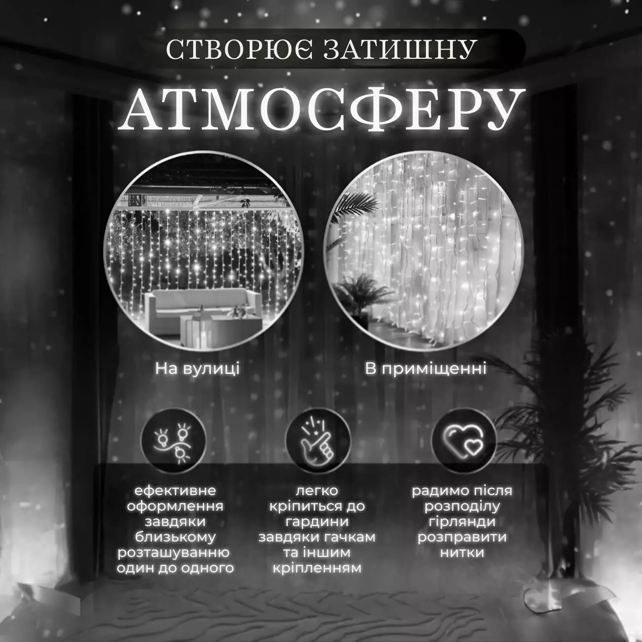 - Чарівний ефект: 270 білих світлодіодів на 10 нитках різної