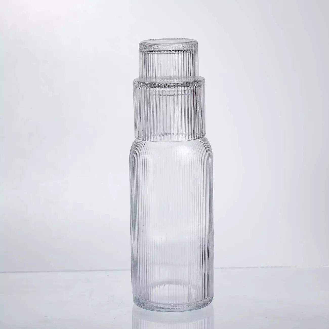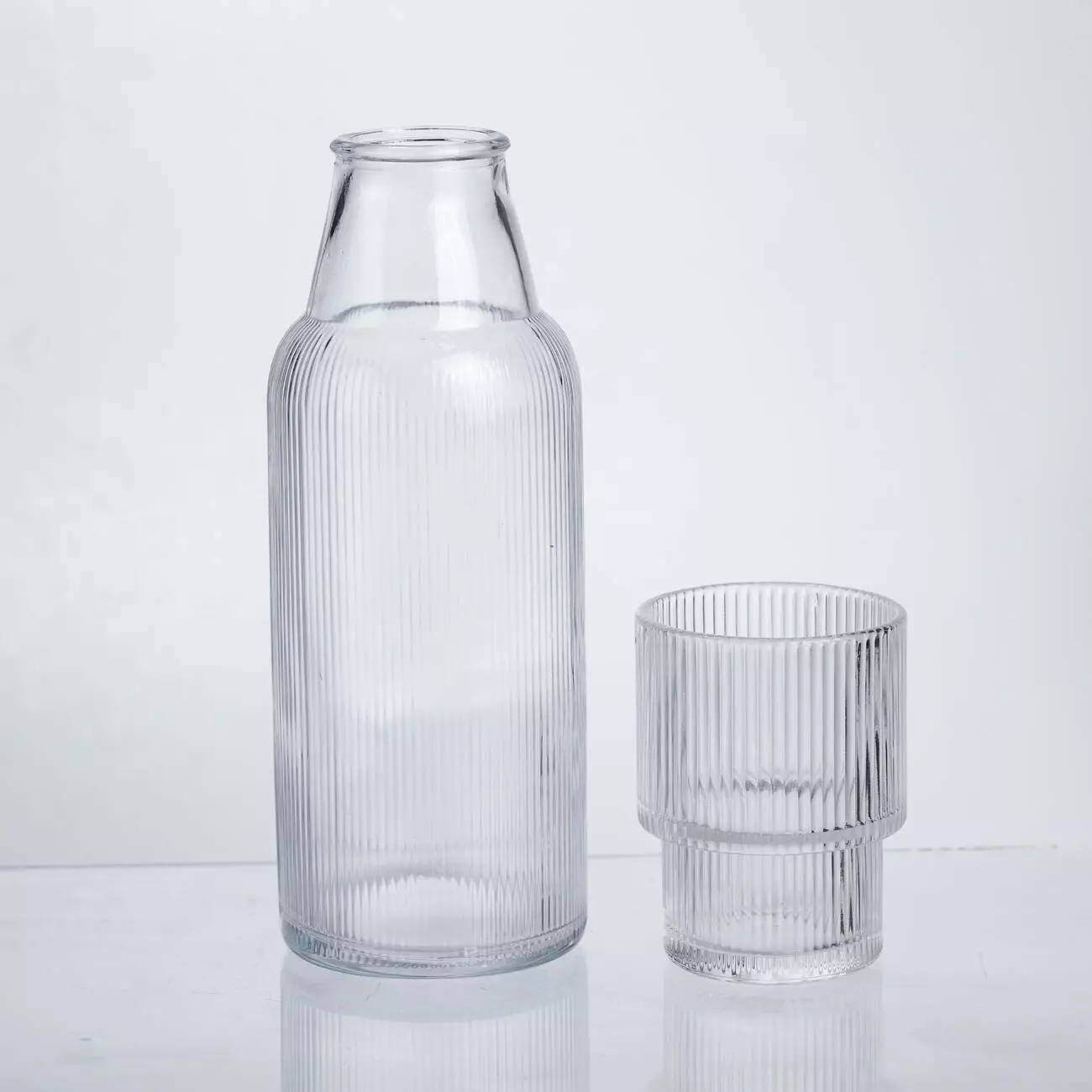 Глечик для напоїв зі склянкою — практичне рішення для щоденного використання вдома, в офісі або в готельних номерах. Виготовлений із товстого, якісного скла, він має ребристу текстуру, що додає естетичності та забезпечує зручність у триманні. Прозора структура скла дозволяє бачити вміст і підкреслює чистоту та свіжість напою.