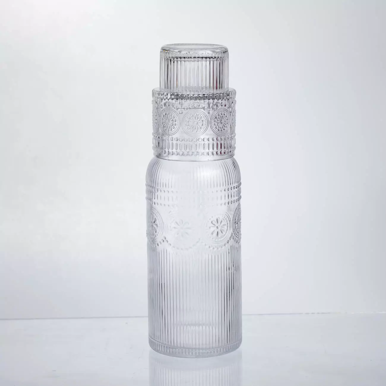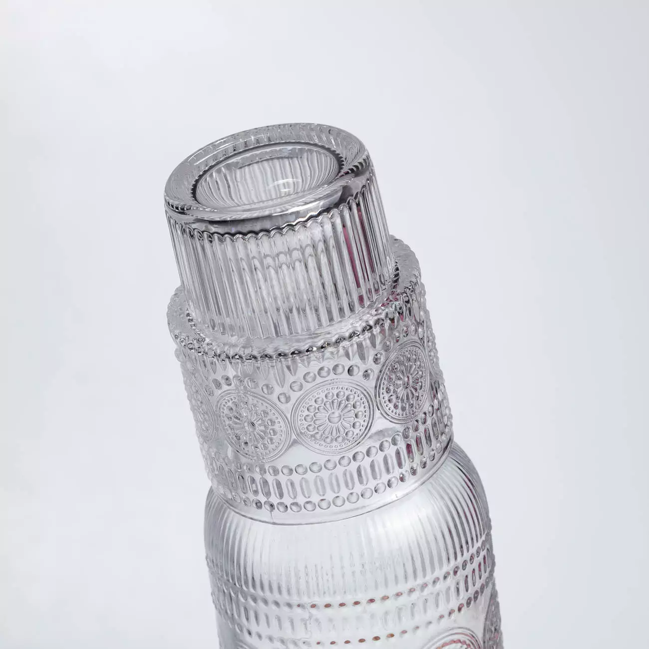 Цей глечик для напоїв зі склянкою поєднує естетику та зручність використання в одному комплекті. Виготовлений із товстого, міцного скла, він має геометричний візерунок, який додає йому оригінальності та робить аксесуар приємним на дотик. Прозоре скло дозволяє бачити вміст, що робить подачу напоїв більш привабливою та сучасною.