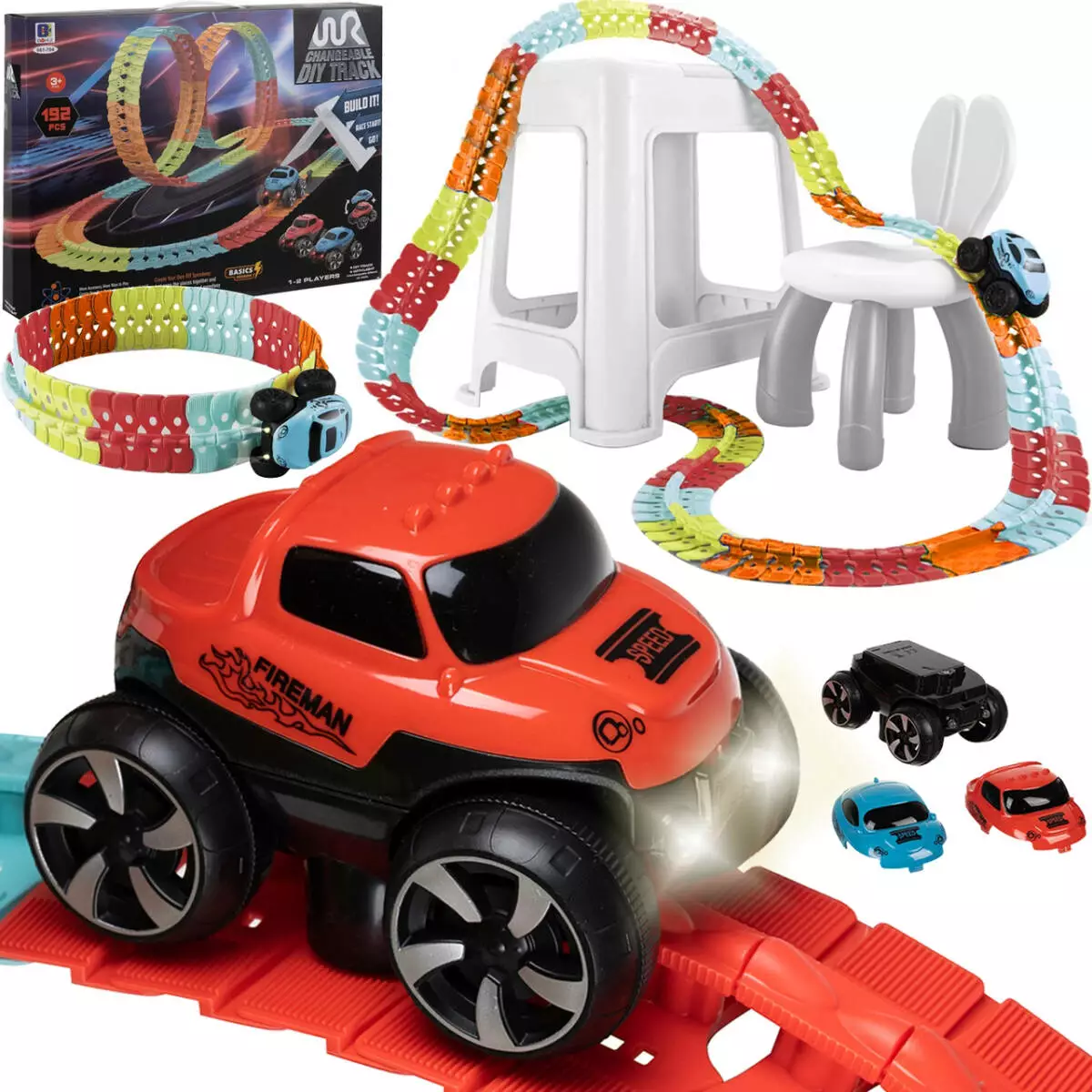 Гнучка доріжка: Набір містить 192 елементи доріжки, з яких можна побудувати трек довжиною 4,80 м. Конструкція доріжки дозволяє робити круті петлі, схили та повороти.