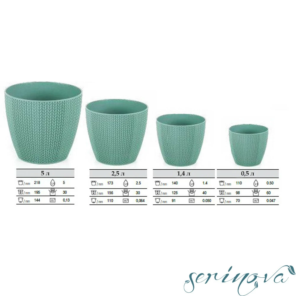 Горщик представлений в декількох об'ємах: 0,5 л; 1,4 л; 2,5 л; 5