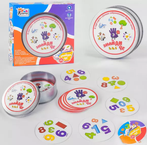 "Знайди це" - це серія міні-ігор на швидкість реакції, уважність та здатність розрізняти образи. Компактна металева коробочка містить круглі карти з картинками. Кожна картка унікальна, але на кожній парі карток є один загальний малюнок. На пошуку збігів побудована гра. Мета гри: на кожній картці по 8 символів і лише один із них збігається із символом на іншій картці. Ваше завдання - швидко знайти його в процесі гри. Набір розрахований на гру від 2 до 8 людей. 5 варіантів настільних міні ігор в одному наборі, допоможуть весело та з користю провести час. Гра стимулює у дітей розвиток пам'яті, концентрацію уваги, розвиток мови та дрібну моторику рук. Комплектація: - 30 ігрових карток; - Інструкція українською мовою.