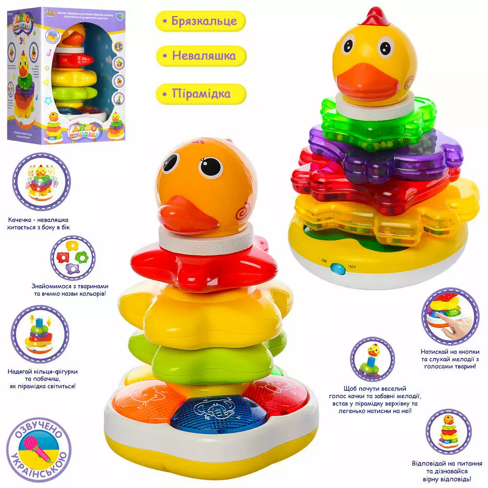 Фотография 1 товарной позиции интернет-магазина детских игрушек www.smarttoys.com.ua Гра 7015-7040 UA пірамідка,навч.(кольори,тварини) неваляшка,брязкальце,2 види,муз.(укр.),світло,бат.
