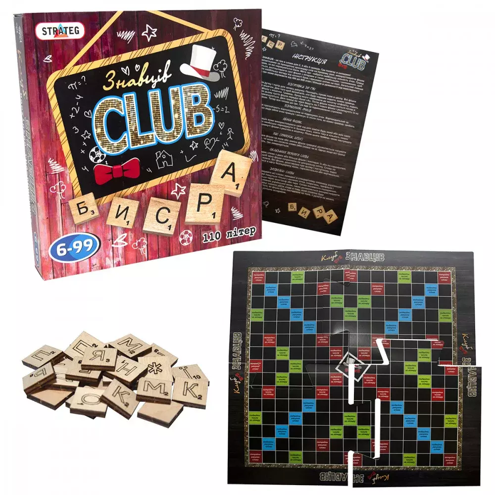 Весела гра «Club Знавців» (702, Strateg) – це чудовий спосіб разом розважитися та дізнатися нові слова! Її суть полягає у складанні слів та розміщення карток на ігровому полі під потрібними номерами. Кожну літеру потрібно розміщувати на клітинці ігрового поля та отримувати бали. Загалом у грі 110 букв. Відчуй себе інтелектуалом! Розвиваюча гра дозволяє набирати очки і заповнювати турнірну таблицю. Кількість можливих учасників – від 2 до 10. Мовою гри є українська. Клуб знавців допоможе розвивати реакцію та логічні здібності, сприяє покращенню навичок спілкування. ? Вік: 6+; ? Комплектація: ігрове поле, кубик, інструкція, фішки-літери; ? Розмір упаковки: 28х28х5.5 см; ? Габарити гри: 47х47 см; ? Матеріал: папір, картон; ? Кількість гравців: від 2 до 10 осіб.
