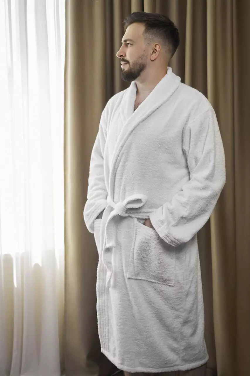 Халат  білий махровий "шаль" з поясом, розмір М. Халат виготовлено з 100% високоякісної бавовни. Ідеально підійде для SPA центрів, салонів краси, готелів, спортивних баз.