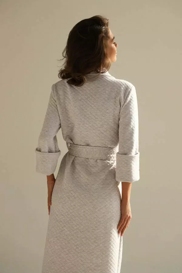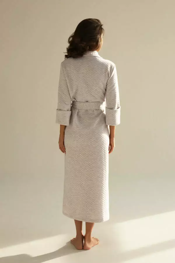 Вишуканий сірий меланж надає халату універсального стилю, який легко впишеться у ваш домашній гардероб. Довжина виробу додає відчуття захищеності та тепла, а зручний крій дозволяє вільно рухатися. Стьобана фактура додає виробу сучасності та робить його ще більш привабливим.