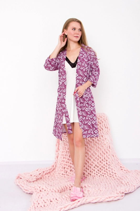Оригінальний, теплий комплект (халат + сорочка). Халат жіночий з рукавом ¾ і з пояском. Халат виготовлений з утепленого полотна - начос. Прекрасно підійде в холодну пору року. Сорочка обшита ніжним, красивим мереживом, що надає ніжності образу. Матеріал добре пропускає повітря, і не сковує рухів. Комплект відмінно підійде для дому і для сну.