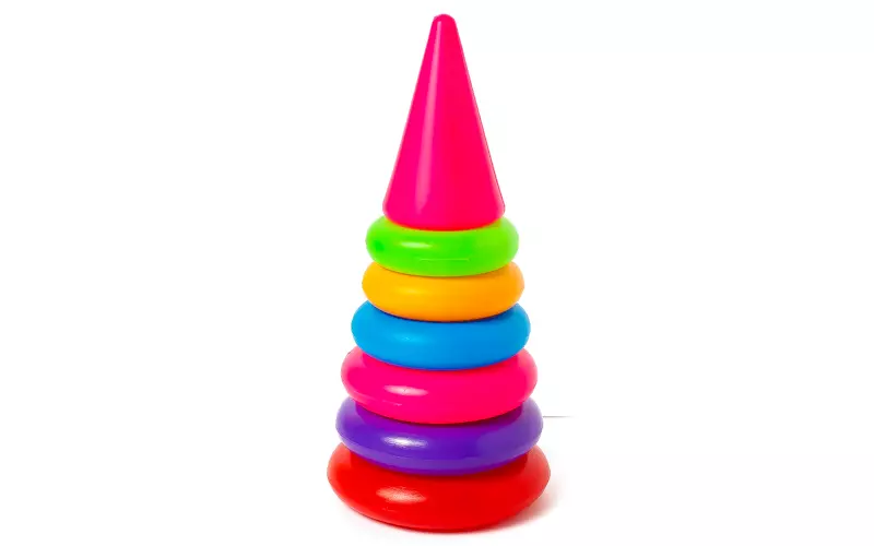 Пірамідка №1. Складається з: основи, верхівки та 6 кілець. Розмір 24 x 11 x 11 см. Вага 110 г.