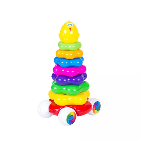 Іграшка пластикова "Пірамідка-каталка". Пластикова пірамідка складається з основи, 7 кілець різного розміру і верхівки у вигляді курчати. Основа на коліщатках, що дозволяє використовувати іграшку як каталку. Розвиває координацію рухів, дрібну моторику та логіку. Упаковка: Сітка Вага в упаковці: 270 г Габарити в упаковці: 30 x 15 x 12,5 см Країна виробник: Україна Матеріал: Пластик Комплектація: Пірамідка-каталка