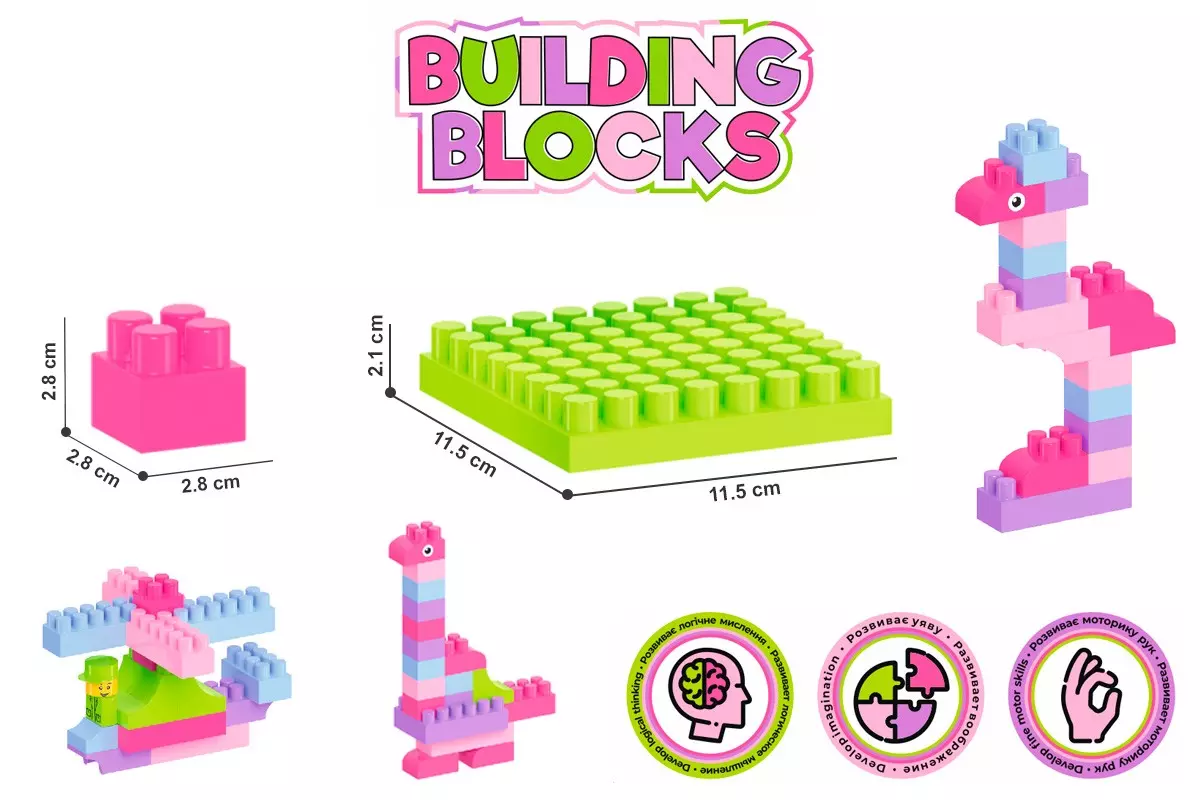 Конструктор – одна з найпопулярніших іграшок серед дітей різного віку. Адже це не тільки захоплива гра, а також корисне розвивальне та навчальне приладдя. Можна сконструювати автомобіль, будиночок, космічний корабель та вивчити додавання і дроби! У наборі 90 цікавих різноманітних деталей вишуканих рожевих кольорів, які так полюбляють юні принцеси. Цеглини зі зрізаними кутами та арками для кораблів чи потішних тваринок, парканчики, віконечка та двері для казкових замків. Нова велика пластина у конструкторах цієї серії — незамінний елемент для будиночків та інших архітектурних форм. Так помешкання для ляльки стає міцнішим, його легко переносити та зручно гратися. Платформи з колесами – взагалі знахідка. Можна збудувати автомобіль, потяг чи літак. А ще платформа стане в пригоді при конструюванні роботів. Фігурка "людини" та додаткові зображення "очей", нанесені методом тамподруку на фігурних елементах – цікава опція, яка додає "життя" конструктору. Зібрані рибки та фламінго відразу "оживають", з ними діткам цікавіше гратися та, особливо, розмовляти. "Конструктор ТехноК" відповідає всім вимогам безпеки, в елементів відсутні гострі краї та сторонній запах. Деталі мають яскравий колір, що не залишаєть на дитячих пальчиках. Цеглини приємні на дотик, легко складаються, водночас зібрана конструкція міцна та тримає форму. Кольорова покрокова інструкція є необхідністю, особливо коли дитина знайомиться з конструктором. Збираючи моделі згідно з інструкцією, малюки досліджують можливості конструктора та вивчають ази побудови базових фігур. Чим все ж таки корисні ігри з конструктором? Головна перевага цієї іграшки — це розвиток важливих навичок для повноцінного розвитку дітей. Конструювання з різних елементів розвиває дрібну моторику та допомагає тренувати координацію рухів. Також, батьки, граючись з дітками, вчать їх новим словам: назви кольорів, форм, тварин, будівель та транспорт. Складаючи цілу конструкцію, у дітей розвивається уява та просторове мислення. Захопливі ігри з конструктором виховують увагу, терпіння та посидючість. Граючись разом, дітки розвивають соціальні та комунікативні навички. Їм доводить співпрацювати, обговорювати подальші кроки та домовлятися для розв'язання поставлених задач. Пробувати, експериментувати, помилятися та переробляти по новому. Ми вчимося через гру, створюючи щось нове, дізнаємося більше про себе та світ! Вага 552 г габаритні розміри ?16 х 28 см Розміри упаковки 55 х 33 х 33.5 см
