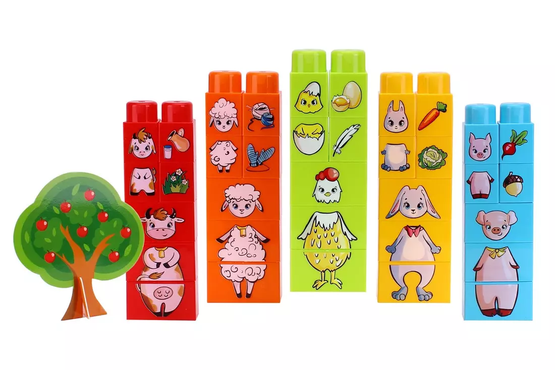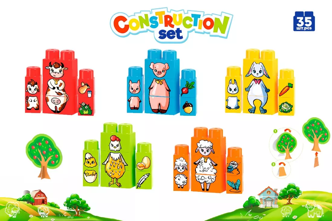 Як зацікавити дитину навчанням? Зробити це у формі гри! Для дітей, ба навіть, дорослих, це є найкращим способом освіти. Під час гри малюкам легше концентруватися на процесі навчання та засвоювати нову інформацію, будувати логічні зв'язки і запам'ятовувати складні поняття. Поштовхом до створення іграшки стала розповідь нашої юної дизайнерки Тані. Одного разу вона розповіла нам про першу в її житті подорож в село. Типове «дитя асфальту», Таня вперше потрапила до своєї бабусі в село в передгір'ї Карпат в 3 роки. І найбільше, що вона запам’ятала з цієї подорожі - це шум гірської річки та милі тваринки господарства бабусі. Вже ввечері вона з захопленням розповідала мамі телефоном, що в бабусі Галі є корівка Муха і телятко Сабріна, корівка пасе травичку та дає молоко та сметану для маленької Тані, курочка несе яєчко, а з вовни овечки роблять м'якенькі светрики. Ми вирішили перетворити дитячі спогади в гру-конструктор, яка допоможе діткам вивчити назви свійських тварини, їх "дітей", улюблені страви та сферу застосування. Всі «герої» нанесені на елементах різного кольору,що значно полегшить пошук відповідних картинок. Діткам потрібно самостійно зібрати основну фігуру з трьох великих цеглин: голова, тулуб і ніжки. А з менших цеглин підібрати їх малюків та смаколики. Додаткового ігрового моменту додає також картонна фігура дерева, яке можна зібрати на ніжку та використовувати під час різноманітних ігор. Крім основної мети – вивчати тварини, іграшка є звичайним конструктором, з якого легко конструювати вежі, будиночки, мости та різні фігури. Всі елементи відвідають по розмірах серії Конструктора ТехноК з великими блоками та можуть поєднуватися з ними. Зображення на цеглини нанесено сучасною технологією – термотрансфер. Такі зображення яскраві, не стираються після багаторазового використання та миття. Всі елементи конструктора виготовленні з високоякісної сировини, без запаху. Головна перевага цієї іграшки— це розвиток важливих навичок для повноцінного розвитку малюків. Конструювання з різних елементів розвиває дрібну моторику та допомагає тренувати координацію рухів. Також, батьки, граючись з дітками, вчать їх новим словам і поняттям: назви кольорів, форм і тварин. Захопливі ігри з конструктором виховують увагу, терпіння та посидючість. Граючись разом, дітки розвивають соціальні та комунікативні навички. Їм доводить співпрацювати, обговорювати подальші кроки та домовлятися для розв'язання поставлених задач. Пробувати, експериментувати, помилятися та переробляти по новому. Ми вчимося через гру, створюючи щось нове, дізнаємося більше про себе та світ! У наборі 35 великих деталей, зручних для діточок вже від 2-х років, картонна фігура дерева. Пакування – яскрава коробка з "віконечком".