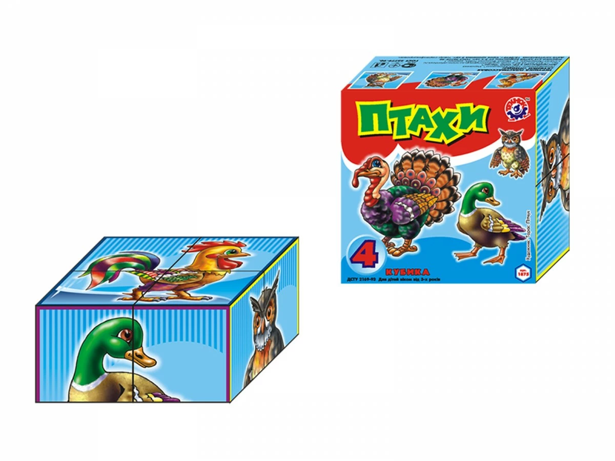 Вага 55 г Габаритні розміри 8?8?4 см Дитячі кубики «Птахи» (1875) українського виробника «Технок», набір з 4-х кубиків за принципом «збери картинку» із зображенням птахів. Такий ігровий набір дозволить дитині розвивати логічне мислення, фантазію і моторику пальців. Дитячі кубики закладають фундамент в свідомість дитини з освоєння фізичного буття нашого світу. За допомогою кубиків маленькі дітки вивчають форми, кольори, розміри і навіть букви і цифри. Підростаючи, вони вчаться будувати і збирати картинки. Ось чому дуже важливо купити кілька наборів кубиків, щоб дати дитині можливість експериментувати, отримувати задоволення від гри і розвиватися.