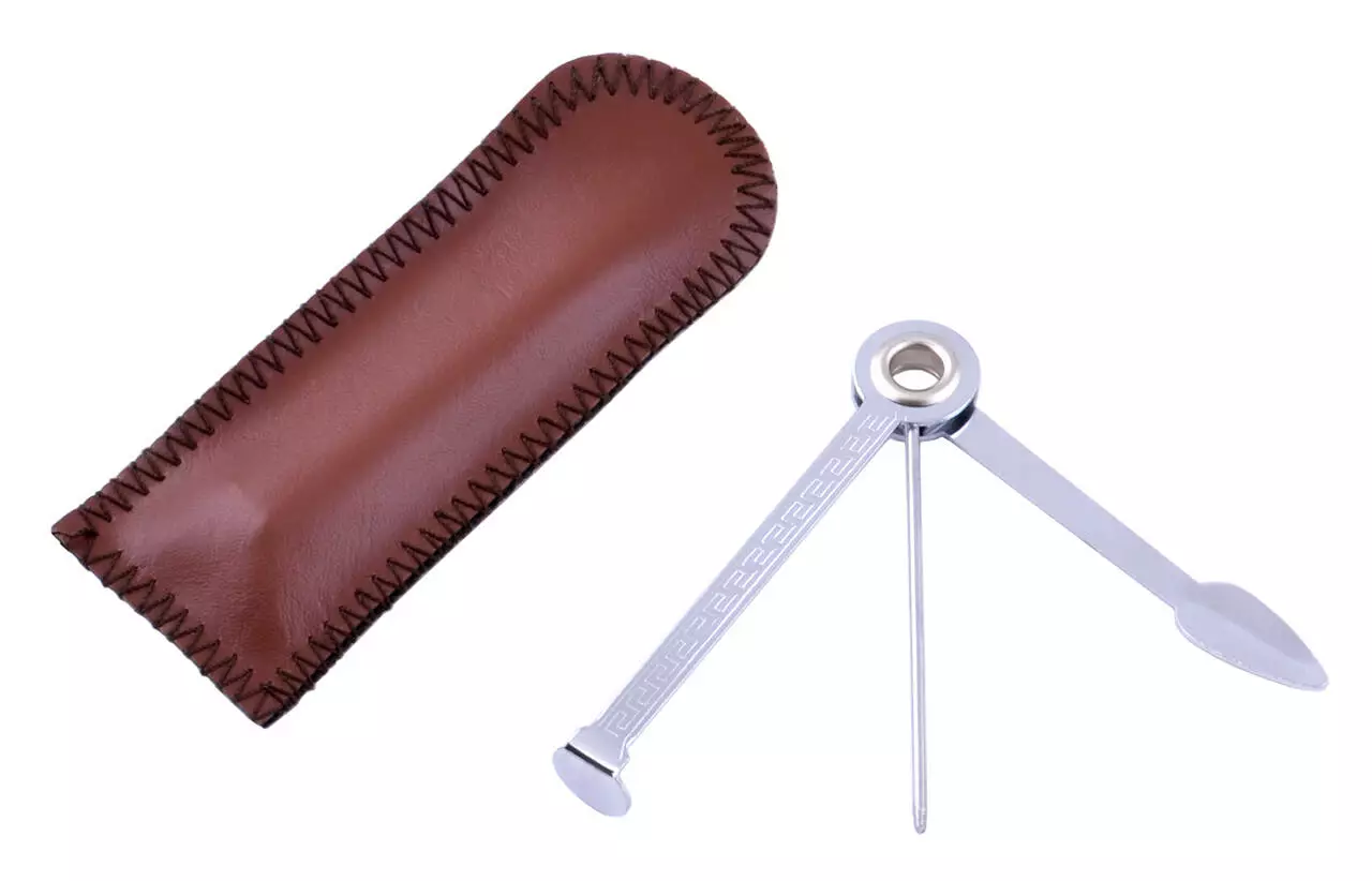 Практичный и стильный аксессуар для курильщиков трубки. Прочный металлический инструмент сочетает в себе три основные функции, необходимые для полноценного ухода: