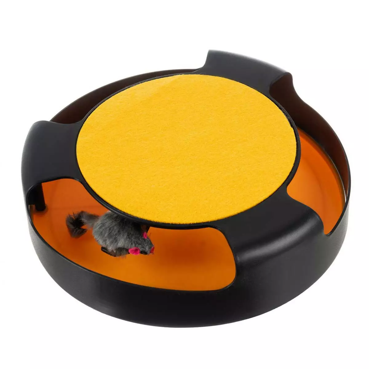 Він має круглу форму і 3 отвори. Отвори досить великі, щоб у них легко поміщалися лапи кішки будь-якого розміру. У центрі знаходиться імітація миші, яка при попаданні в неї лапою починає рухатися і обертається по колу кола, заохочуючи кішку продовжувати гру.