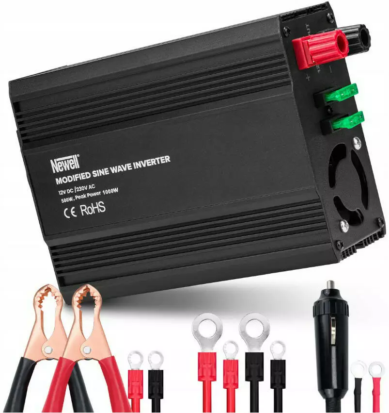 Преобразователь напряжения Newell с модифицированной синусоидой - 12 В / 230 В, 500 Вт - идеальный выбор для тех, кто часто путешествует или хочет использовать свои любимые устройства там, где нет доступа к традиционным электрическим розеткам. Он превратит в универсальный источник питания аккумулятор или автомобильный прикуриватель. Устройство оснащено 1 традиционной электрической розеткой (стандарт E) и 1 гнездом USB-A. К инвертору можно легко подключать такие устройства, как обогреватели, ноутбуки, смартфоны, планшеты, кофемолки и многое другое. Максимальная полезная мощность инвертора составляет 500 Вт. Помимо обычных кабелей и кабеля для гнезда прикуривателя, удобно использовать кабели с зажимами (хомутами), которые еще больше упростят подключение устройства к аккумуляторам.