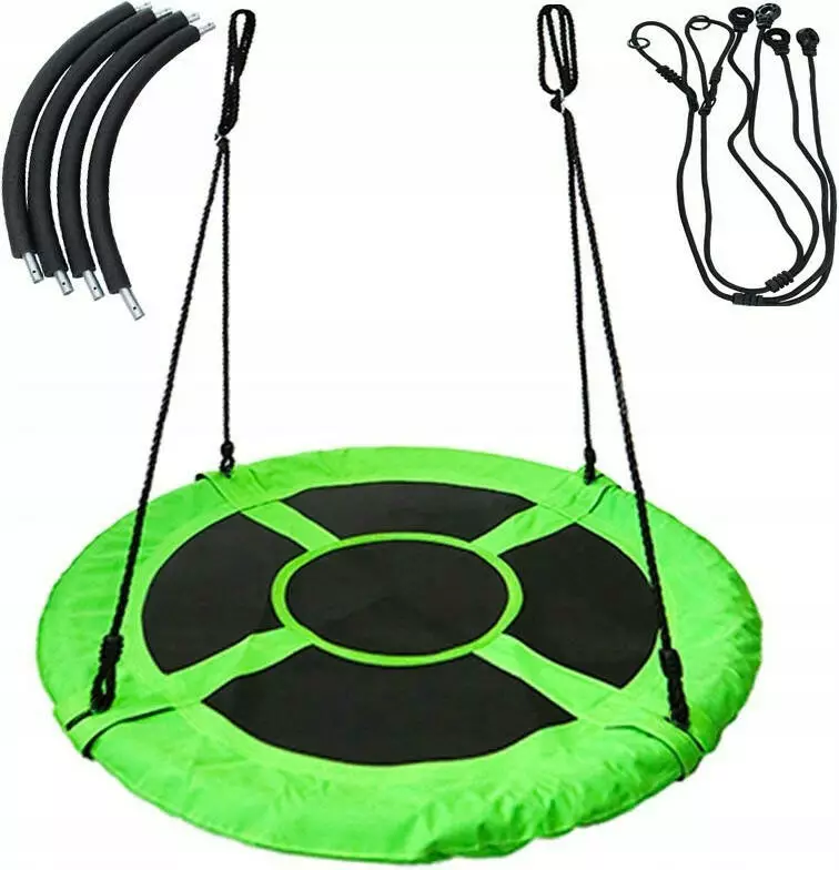 Качели регулируются по высоте, что позволяет настроить их под свои нужды. Оснащен металлическими кольцами для крепления, что обеспечивает простоту сборки. Благодаря простой конструкции гнездо можно спрятать на зиму и мы получаем возможность длительного использования в течение нескольких сезонов.