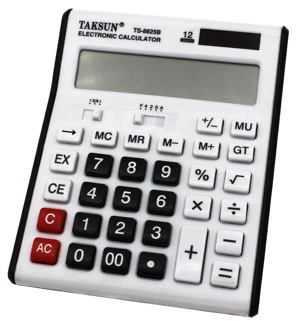 Большой калькулятор в черно-белом цвете. Упакован в коробку. Поддерживает все функции для подсчетов. Размеры 13.6х3х17х3 см. Работает от батареек.