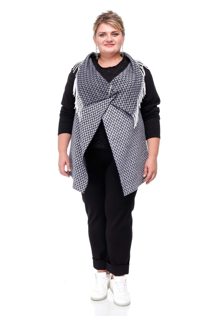 Тканина: плед -50% бавовна; 30% поліестер; 20% акрил. Теплий та стильний кардиган виконаний із пальтової тканини. Виріб із запахом, застібається на гарну шпильку, яка йде в комплекті. Ворот з бахрамою, виріз горловини регулюється шпилькою. Без рукавів.