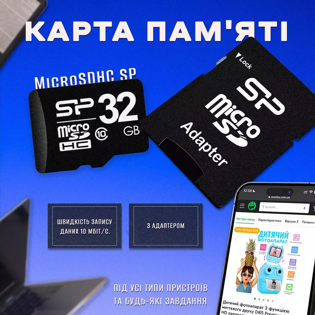 адаптер в комплекте делает карту универсальной. Она подходит для