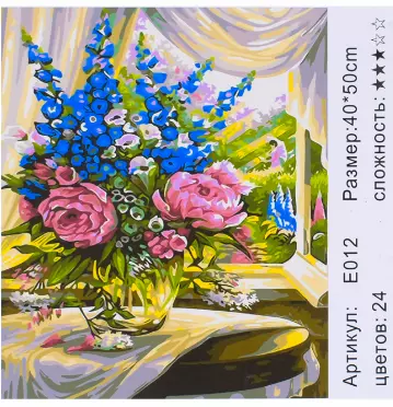 Тип картини - квіти; Складність - 3; Матеріал полотна - бавовна; Розмір полотна - 50х40см Фарби в наборі - є; Упаковка - коробка. ? Комплектація: - полотно на підрамнику; - кисті різної товщини; - фарби в пронумерованих баночках; - контрольний лист; - кріплення для картини.