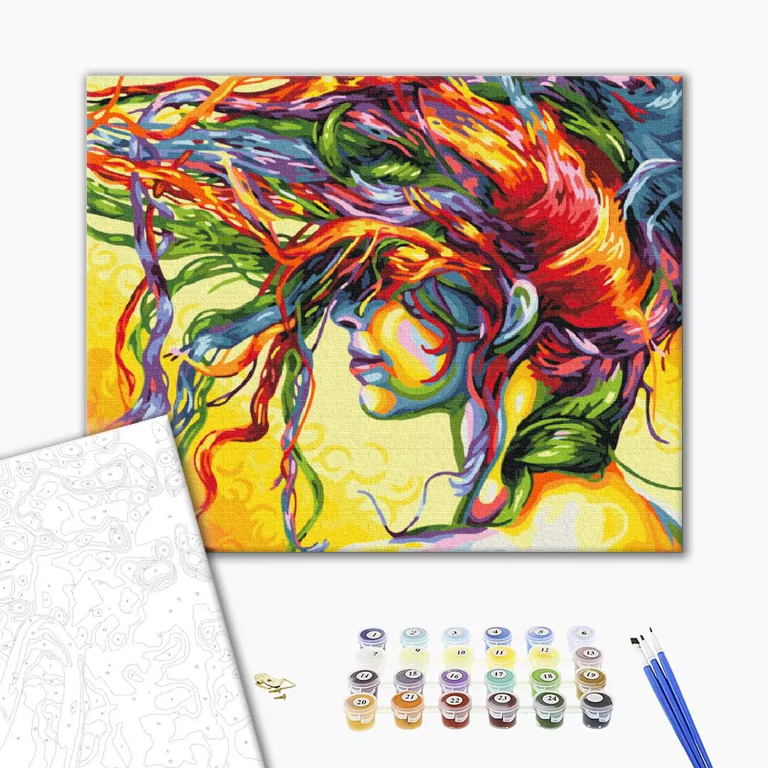 У набір входить: бавовняне полотно на дерев'яному підрамнику з нанесеною пронумерованій схемою майбутньої картини 3 кисті різної товщини акрилові пронумеровані фарби кріплення до стіни для готової картини