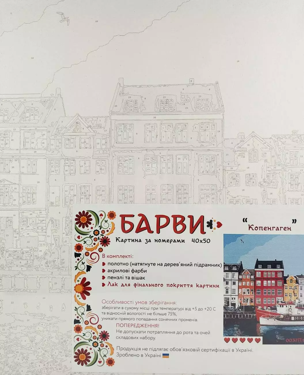 Відчуй себе справжнім художником! Використовуй розпис по номерам і твори шедеври! Дана картина добре прикрасить будь-який інтер'єр і подарує кожному твоєму гостю відчуття перебування вдома у справжнього генія! Увага! Кольори і чіткість картини можуть відрізнятися. Комплектація Набору для малювання: - натягнутий на дерев'яну рамку прогрунтоване полотно, з нанесеними і пронумерованими контурами квітів малюнка. Полотно і весь набір запаяний в стрейч плівку; - настінні кріплення 2 шт. і саморізи; - пронумеровані акрилові фарби в щільно закритих контейнерах (від 14 до 36 кольорів); - кисті (від 3 до 4 шт).
