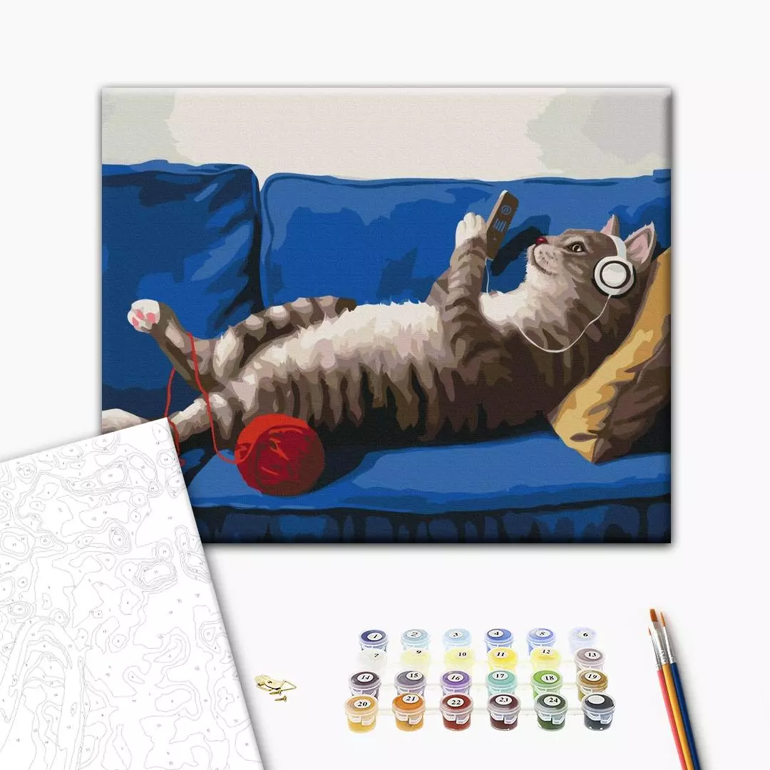 У набір входить: бавовняне полотно на дерев'яному підрамнику з нанесеною пронумерованій схемою майбутньої картини 3 кисті різної товщини акрилові пронумеровані фарби кріплення до стіни для готової картини