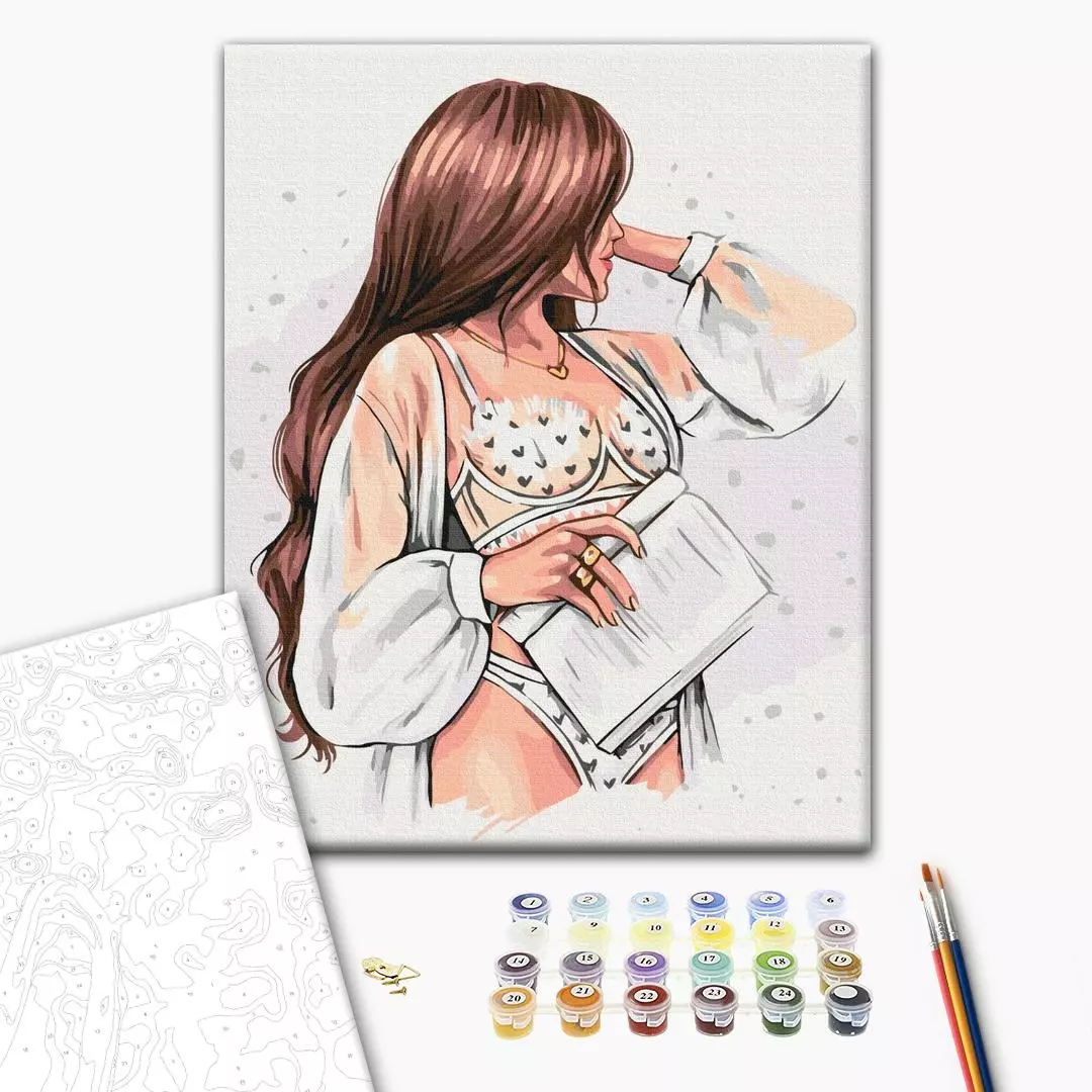 У набір входить: бавовняне полотно на дерев'яному підрамнику з нанесеною пронумерованій схемою майбутньої картини 3 кисті різної товщини акрилові пронумеровані фарби кріплення до стіни для готової картини