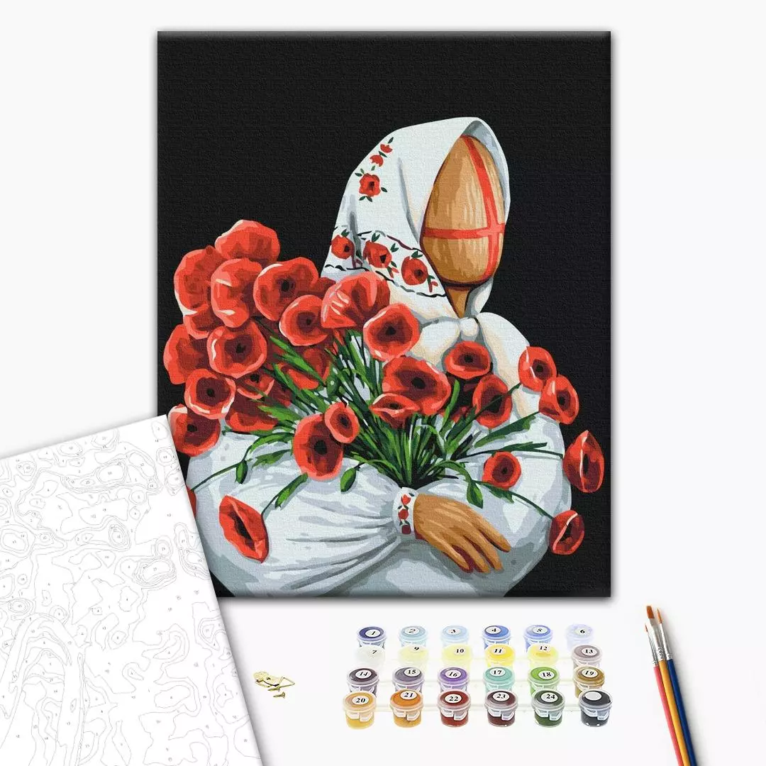 У набір входить: бавовняне полотно на дерев'яному підрамнику з нанесеною пронумерованій схемою майбутньої картини 3 кисті різної товщини акрилові пронумеровані фарби кріплення до стіни для готової картини