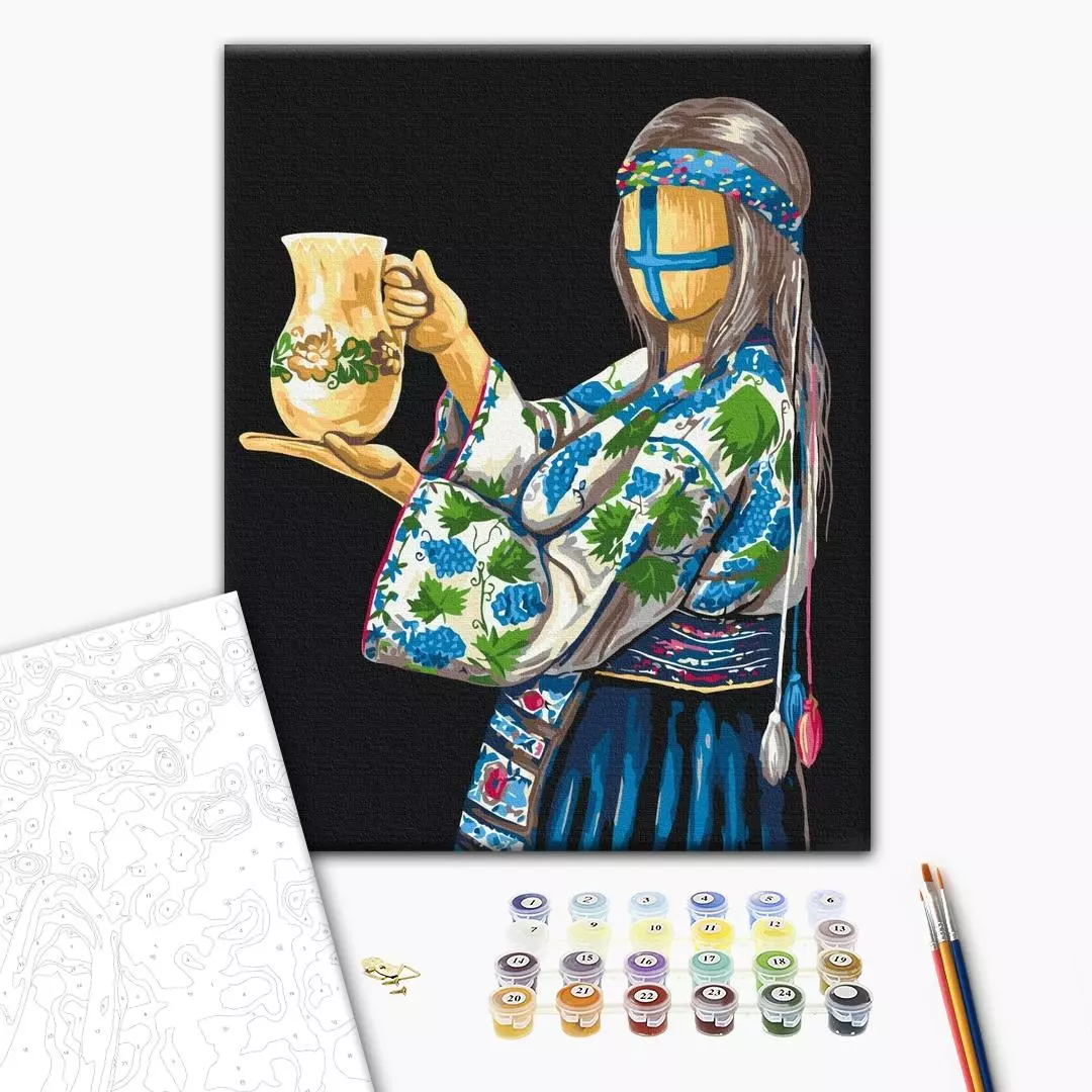 У набір входить: бавовняне полотно на дерев'яному підрамнику з нанесеною пронумерованій схемою майбутньої картини 3 кисті різної товщини акрилові пронумеровані фарби кріплення до стіни для готової картини