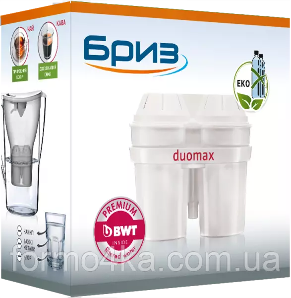 Картридж БРИЗ duomax производит полный спектр очистки воды, удаляет вредные для здоровья органические соединения, хлор, хлорид, бензолы, нитраты, фенол, снижает содержание пестицидов.