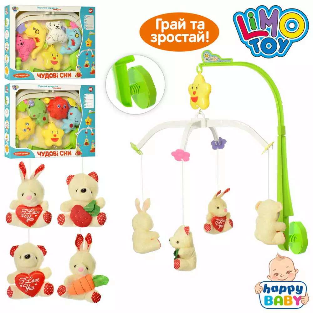 Фотография 1 товарной позиции интернет-магазина детских игрушек www.smarttoys.com.ua Карусель D070-1-2 на ліжечко, заводна, муз., світло, 4 шт., плюш, 3 види, кор., 40,5-30-5 см