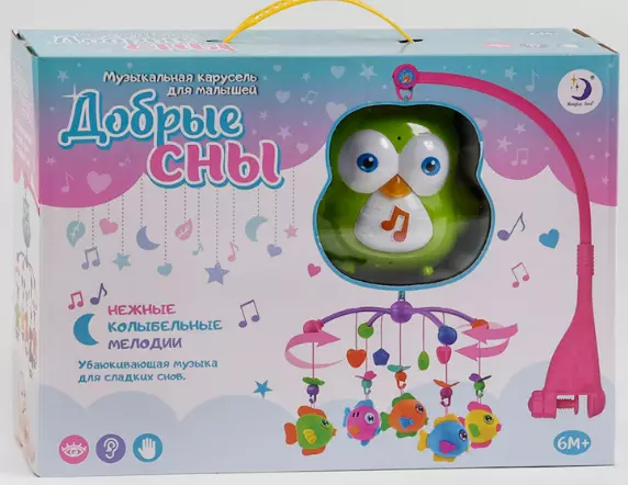 Дитяча музична карусель HL 2018-48 R “Добрі сни” - це дитячий мобіль з ніжними колисковими для Вашого милого малюка. Блок управління виконаний у формі милої совушки, яка занурить малюка в солодкий сон своїми звуковими ефектами, а дзьобик, що світиться, буде підсвічувати кімнату і відганяти неприємні сновидіння. У наборі Ви також знайдете 5 милих підвісок славних тварин з гримаючими елементами, гумовими кільцями-прорізувачами та петелькою на верхівці. Вдень підвіски-брязкальця можна використовувати як повсякденні іграшки для дитини. Функції каруселі: - ВКЛ викл; - заколисливі колискові мелодії; - підсвічування; - Автоматичне обертання каруселі. Різноманітність деталей мобіля допоможе покращити сприйняття кольору, сенсорно-зорову координацію, образне і творче мислення, а приємні на дотик детальки - дрібну моторику рук. У комплекті передбачена докладна інструкція зі збирання та функціонування каруселі. Іграшка працює від 3-х батарейок типу "АА" 1.5V (не входять до комплекту).